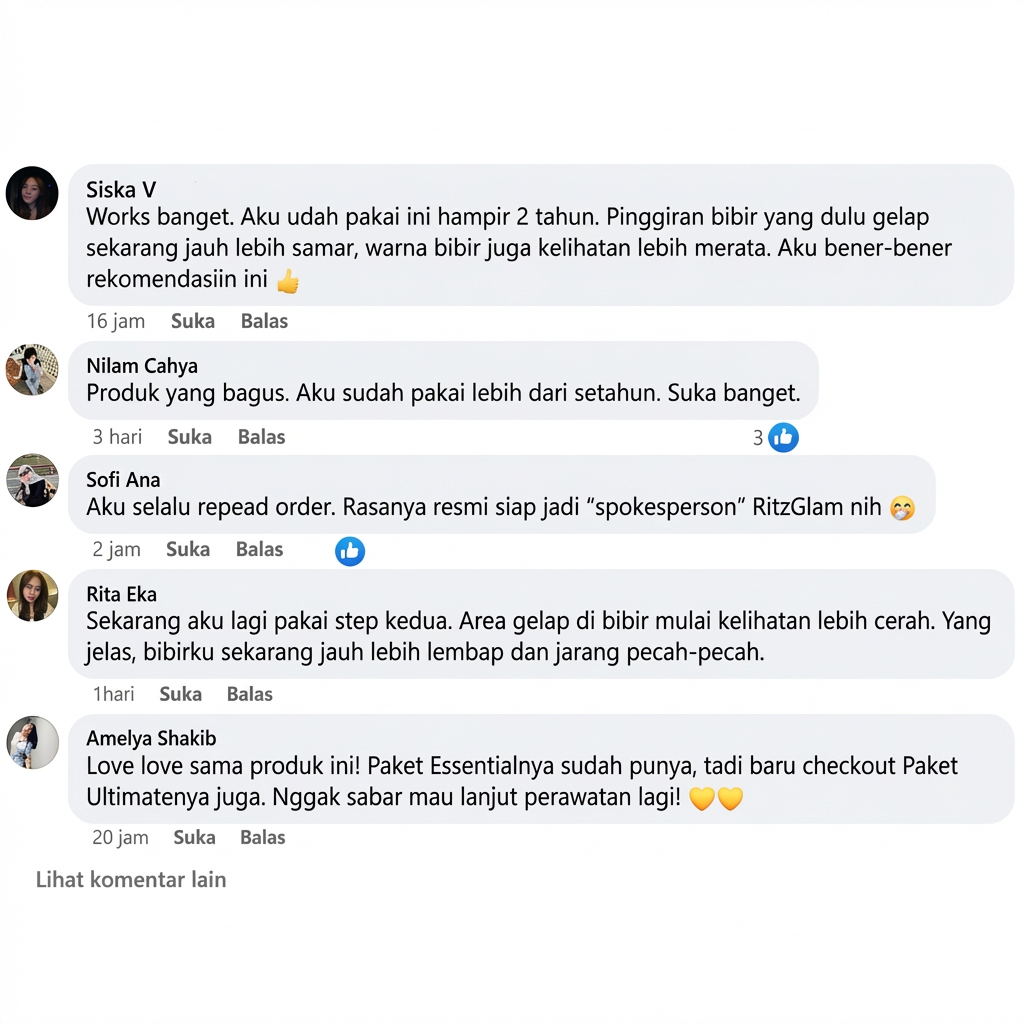 "Lengkap banget! Yang penting nggak bikin pusing campur-campur merk. Worth it banget buat harga segitu, udah kayak treatment di klinik kecantikan tapi lebih simpel. Bibir sekarang pink alami dan lembap"